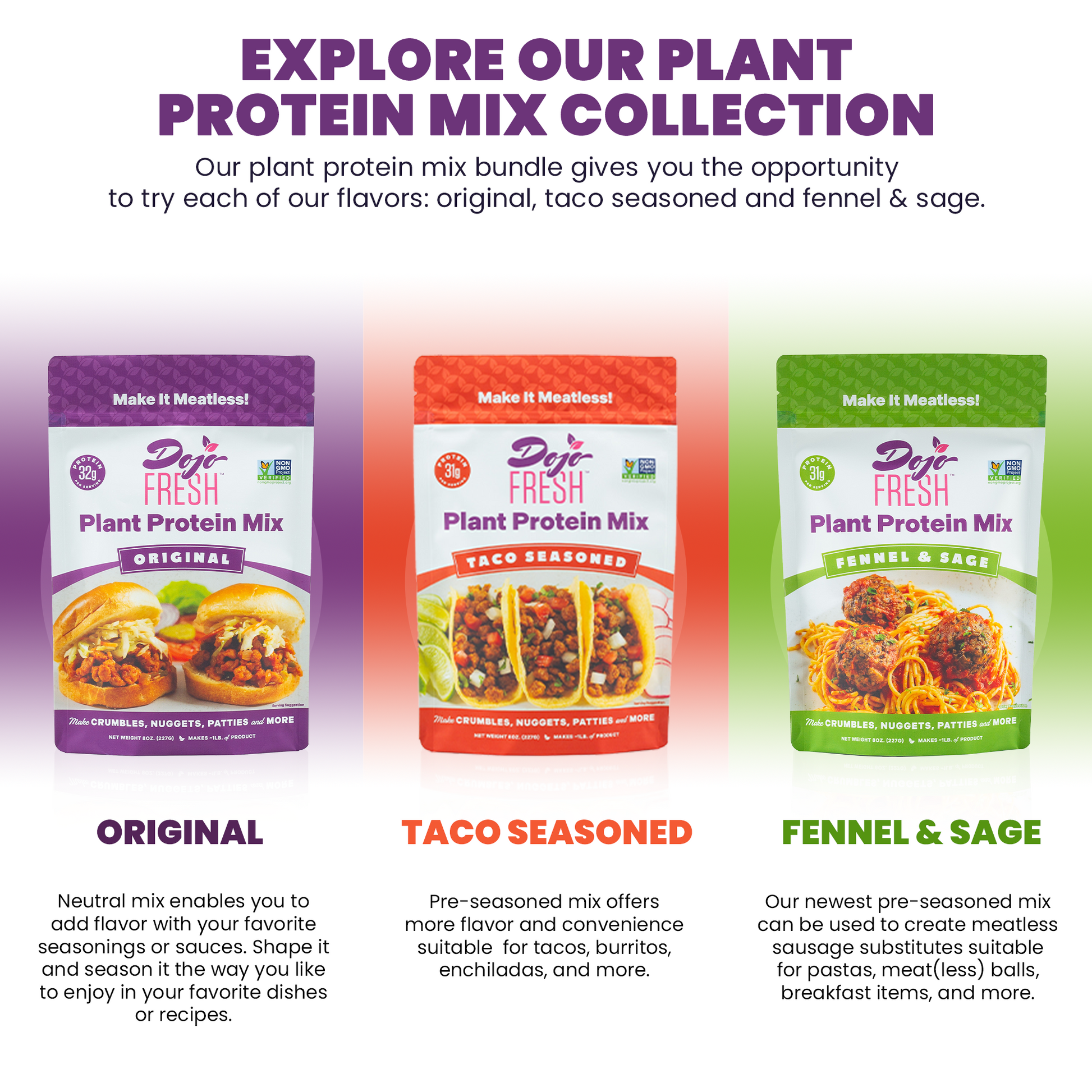 - 3 Flavors of Plant Protein Mix (Original, Taco, Fennel & Sage)